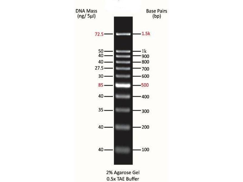 The ExcelBand 100 bp DNA Ladder is a ready-to-use DNA ladder, which is pre-mixed with loading dye for direct loading on gel. The DNA marker is composed of 11 individual DNA fragments: 1.5k, 1k, 900, 800, 700, 600, 500, 400, 300, 200 and 100 bp derived from a mixture of PCR products and specifically digested plasmid DNA.