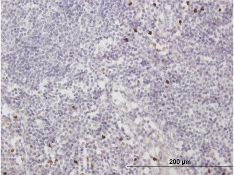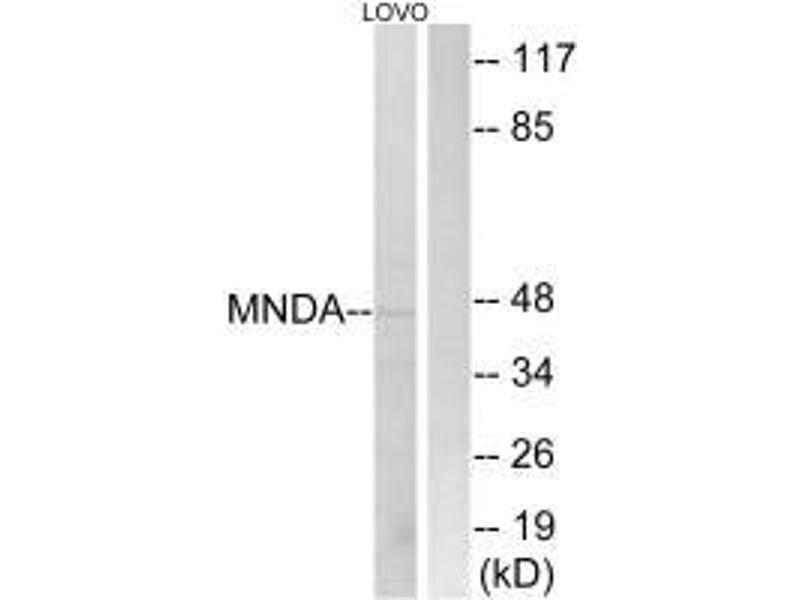 The myeloid cell nuclear differentiation antigen (MNDA) is detected only in nuclei of cells of the granulocyte-monocyte lineage. A 200-amino acid region of human MNDA is strikingly similar to a region in the proteins encoded by a family of interferon-inducible mouse genes, designated Ifi-201, Ifi-202, and Ifi-203, that are not regulated in a cell- or tissue-specific fashion. The 1.8-kb MNDA mRNA, which contains an interferon-stimulated response element in the 5-prime untranslated region, was significantly upregulated in human monocytes exposed to interferon alpha. MNDA is located within 2,200 kb of FCER1A, APCS, CRP, and SPTA1. In its pattern of expression and/or regulation, MNDA resembles IFI16, suggesting that these genes participate in blood cell-specific responses to interferons. [provided by RefSeq, Jul 2008].