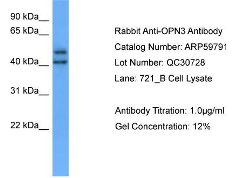 Opsins are members of the guanine nucleotide-binding protein (G protein)-coupled receptor superfamily. In addition to the visual opsins, mammals possess several photoreceptive non-visual opsins that are expressed in extraocular tissues. This gene, opsin 3, is strongly expressed in brain and testis and weakly expressed in liver, placenta, heart, lung, skeletal muscle, kidney, and pancreas. The gene may also be expressed in the retina. The protein has the canonical features of a photoreceptive opsin protein. [provided by RefSeq, Jul 2008].