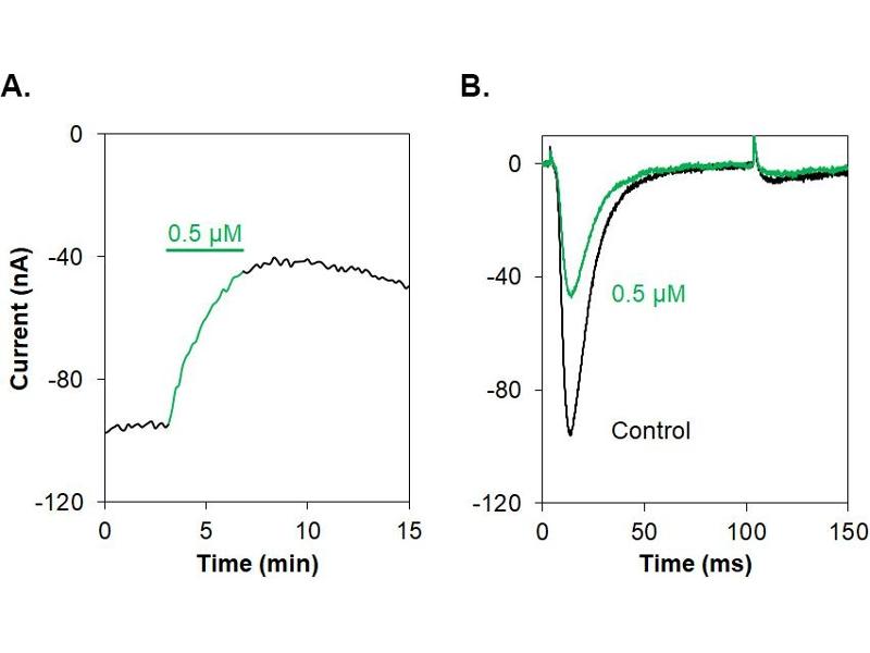 - M-TRTx-Gr1a, M-theraphotoxin-Gr1a, GsMTx4,GsMTx-4 is a 34 amino acid peptidyl toxin originally isolated from the Grammostola rosea (Chilean rose) tarantula venom and belongs to the huwentoxin-1 family1. This toxin inhibits different channels and in addition has antimicrobial activity. It blocks cation-selective mechanosensitive ion channels (strech-activated channels, SACs), without having an effect on whole-cell voltage-sensitive currents1. In addition, it inhibits atrial fibrillation2 as well as the membrane motor of outer hair cells3 at low doses. A medium toxicity on a large spectra of voltage-gated Na+ channels, namely NaV1.1, NaV1.2, NaV1.3, NaV1.4, NaV1.5, NaV1.6 and NaV1.7 was reported. GsMTx-4 also inhibits K+ channels KV11.1 and KV11.2, whereas it does not inhibit K+ channels KV1.1 (IC50 > 85 μM), KV1.4 (IC50 > 85 μM) and KV11.3 (IC50 = 53 μM)4. GsMTx-4 was also found to inhibit both TRPC1 and TRPC6 channels5,6, as well as Piezo1, the mechanosensitive channel7. Antimicrobial activity is shown against several Gram-positive and Gram-negative bacteria as well8.