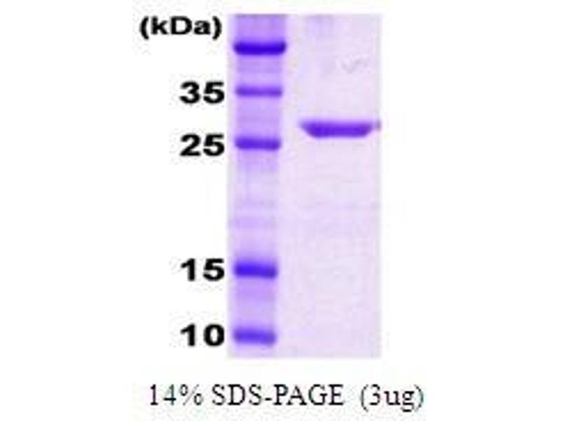 DNAK, originally identified for its DNA replication by bacteriophage in E. coli is the bacterial hsp70 chaperone. The protein coding region of the substrate binding domain of DNAK (amino acids 385-546) was amplified by PCR and cloned into an E. coli expression vector. The substrate binding domain of DNAK was overexpressed in E. coli and the recombinant protein was purified to apparent homogeneity by using conventional column chromatography techniques. Additional amino acid(Met) is attached at N- terminus. Alternative Names: Heat shock 70 kDa protein protein, Chaperone protein dnaK protein, dnaK protein, Co chaperone with DnaJ protein, Dnak (C-term protein, , Heat shock protein 70 protein, Substrate binding domain protein, Chaperone Hsp 70 protein, HSP70 protein, Heat shock 70 kDa protein protein, 385-638) protein