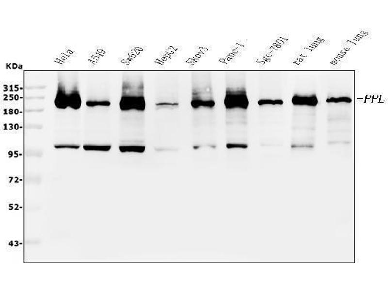 The protein encoded by this gene is a component of desmosomes and of the epidermal cornified envelope in keratinocytes. The N-terminal domain of this protein interacts with the plasma membrane and its C-terminus interacts with intermediate filaments. Through its rod domain, this protein forms complexes with envoplakin. This protein may serve as a link between the cornified envelope and desmosomes as well as intermediate filaments. AKT1/PKB, a protein kinase mediating a variety of cell growth and survival signaling processes, is reported to interact with this protein, suggesting a possible role for this protein as a localization signal in AKT1-mediated signaling. [provided by RefSeq, Jul 2008].