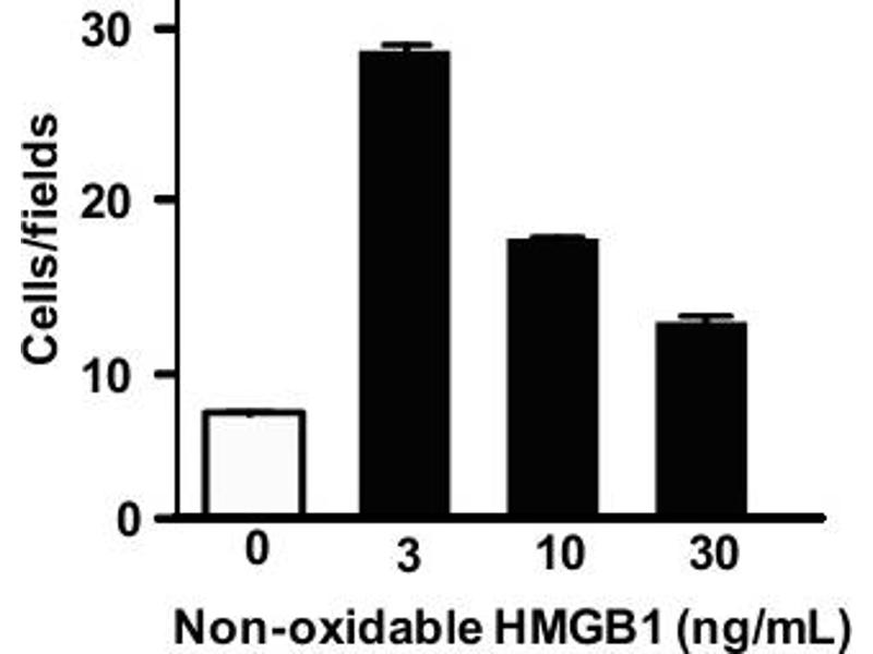 This product is a mutant protein where all cysteines are replaced with serines. Non-oxidizable chemokine-HMGB1, LPS free, has chemoattractant activity in vitro and in vivo, does not have cytokine-inducing activity and is resistant to inactivation by ROS. This product is produced in E.coli. The product can be used to recruit leukocytes in vivo without inducing cytokine/chemokine production (Venereau et al, 2012). It contains only trace amounts of LPS (<0.4 ng/mg protein), and is tested for the ability y to induce fibroblast migration. LPS free. Measured by its ability to induce migration. Maximal activity in the cell migration assay is obtained at 1 nM.