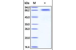 - This protein carries no "tag". The protein has a calculated MW of 49 kDa. The protein migrates as 60-70 kDa under reducing (R) condition (SDS-PAGE) due to glycosylation.