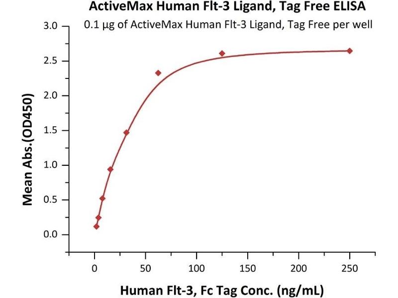 FMS-like tyrosine kinase 3 ligand (Flt-3 Ligand) is also known as FL, Flt3L and FLT3LG, is an α-helical cytokine that promotes the differentiation of multiple hematopoietic cell lineages. FLT3LG is expressed as a noncovalentlylinked dimer by T cells and bone marrow and thymic fibroblasts. Each 36 kDa chain carries approximately 12 kDa of N- and O- linked carbohydrates. FLT3LG is structurally homologous to stem cell factor (SCF) and colony stimulating facor 1 (CSF-1). FLT3LG acts as a growth factor that increases the number of immune cells by activating the hematopoietic progenitors. It also induces the mobilization of the hematopoietic progenitors and stem cells in vivo which may help the system to kill cancer cells. FLT3LG induces the expansion of monocytes and immature dendritic cells as well as early B cell lineage differentiation. FLT3LG cooperates with IL2, IL6, IL7, and IL15 to induce NK cell development and with IL3, IL7 and IL11 to induce terminal B cell maturation. Animal studies also show FLT3LG to reduce the severity of experimentally induced allergic inflammation. FLT3LG is crucial for steady-state pDC and cDC development. A lack of FLT3L results in low levels of DCs.