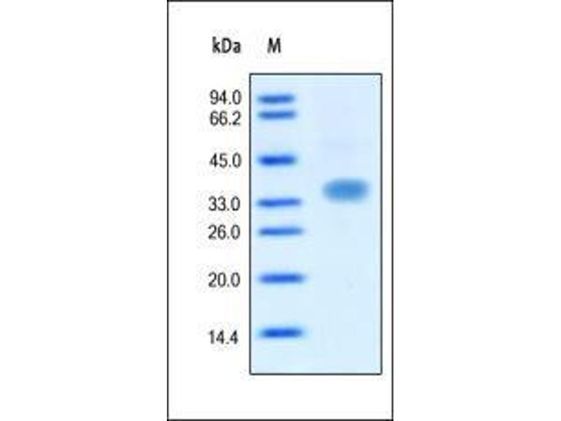 This protein carries no "tag". The protein has a calculated MW of 25.8 kDa. The protein migrates as 36 kDa under reducing (R) condition (SDS-PAGE) due to glycosylation.