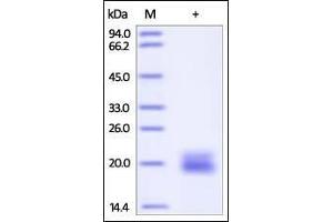 - This protein carries no "tag". The protein has a calculated MW of 17.2 kDa. The protein migrates as 18-22 kDa under reducing (R) condition (SDS-PAGE) due to glycosylation.