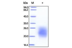 - The product does NOT contain any epitope tags. The protein has a calculated MW of 14.5 kDa. The protein migrates as 18-28 kDa on a SDS-PAGE gel under reducing (R) condition due to glycosylation.