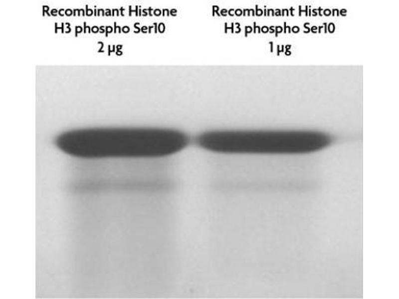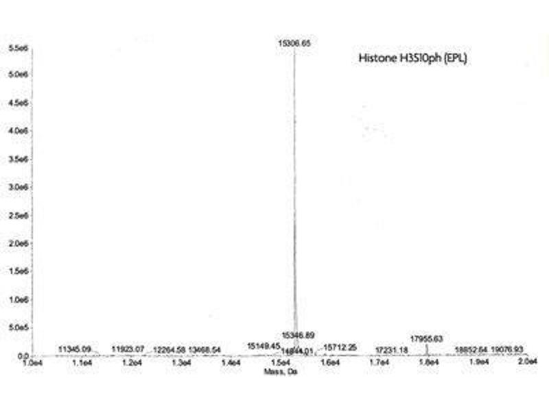 - Recombinant Histone H3 phospho Ser10 (H3S10ph) proteins are generated using expressed protein ligation (EPL) technology. Truncated human Histone H3.2 is produced in E. coli and purified using FPLC. The purified protein is subsequently ligated to a N-terminal histone tail peptide containing phosphorylated serine 10 via a native peptide bond. The full-length protein is then repurified prior to lyophilization. Protein concentration was determined using the molar extinction coefficient for Histone H3 and absorbance at 280nm. The recombinant histone is >98 % pure by SDS-PAGE and confirmed by high-resolution ESI-TOF mass spectrometry. The molecular weight of the recombinant histone is 15,306 Daltons.