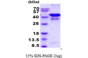 GLUL also known as Glutamine synthetase. It is a trimetallic enzyme containing two divalent cation sites and one monovalent cation site per subunit. GLUL is able to regulate intracellular concentrations of glutamate and catalyzes the synthesis of glutamine form glutamate and ammonia. It is ubiquitously expressed in the human and plays a major role for many metabolic pathways such as cell proliferation, inhibition of apoptosis, and cell signaling. Recombinant Human GLUL was expressed in E. coli and purified by using conventional chromatography techniques