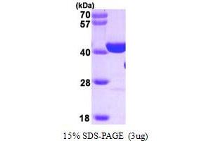PARP1 is a nuclear DNA-binding zinc finger protein which can exist as a homo- or hetero-dimer, and is strongly activated by DNA strand breaks. This protein involved in chromatin architecture and DNA metabolism, and participates in protein modification to enhance or repress transcription. PARP1 also plays a role in other cellular processes, including cell proliferation and differentiation. PARP-1 deficiencies lead to chromosomal instability due to higher frequencies of chromosome fusions and aneuploidy, suggesting that poly (ADPribosyl) ation contributes to the efficient maintenance of genome integrity. Recombinant PARP1 protein was expressed in E. coli and purified by using conventional chromatography techniques.