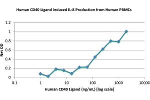 - The activity is tested by HEK-blue ™ CD40L Activity. Acceptable Level <50ng/mL, >2.0x10^4 units/mg. Additionally testing by ELISA: IL-8 production by human PBMCs.