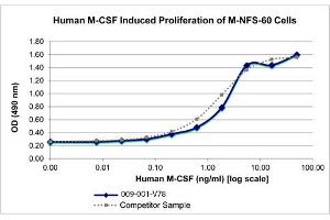 Application Note: Macrophage Colony Stimulating Factor Recombinant Protein has been tested by SDS-PAGE and biological activity and s suitable as a control for polyclonal or monoclonal anti-Macrophage Colony Stimulating Factor in immunological assays. Lyophilized in 10 mM sodium phosphate, 100 mM sodium chloride, pH 8.0.