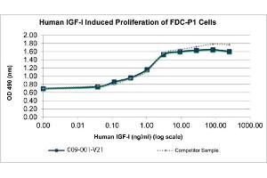 Background: Insulin-like Growth Factor I, IGF-I, is a growth factor produced by the liver when stimulated with growth hormone and can be found circulating throughout the body . IGF-I activates the IGF-I receptor (IGF1R) and the insulin receptor to mediate growth of almost every cell of the body. IGF-I is known as one of the most potent activators of the AKT signaling pathway which is known to be a stimulator of proliferation and an inhibitor of programmed cell death. Mature human IGF-I is 100 % homologous with bovine and porcine proteins. Recombinant human IGF-I is a non-glycosylated protein, containing 70 amino acids, with a molecular weight of 7.7 kDa.