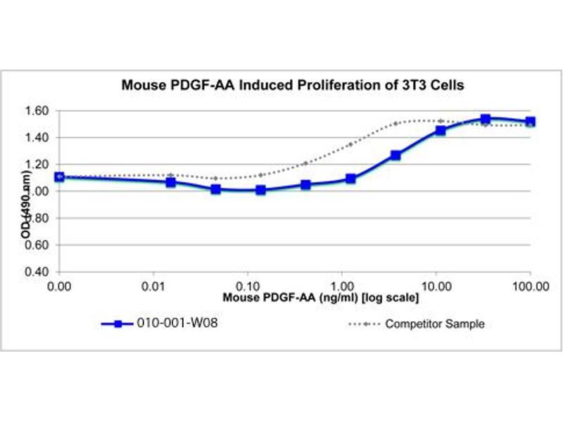 Background: Platelet-Derived Growth Factor (PDGF) is a mitogenic peptide growth hormone carried in the alpha-granules of platelets and is released when platelets adhere to traumatized tissues. Connective tissue cells near the traumatized region respond by initiating the process of replication. The synthesis of PDGF can be induced by IL-1, IL-6, TNF-α, TGF-β and EGF. Recombinant mouse PDGF-AA is a non-glycosylated, disulfide-linked homodimer, containing two 126 amino acid chains, with a total molecular weight of 28.9 kDa.