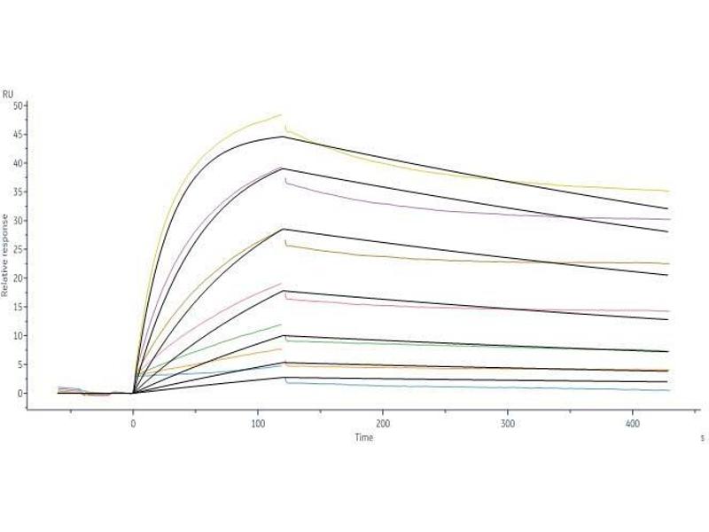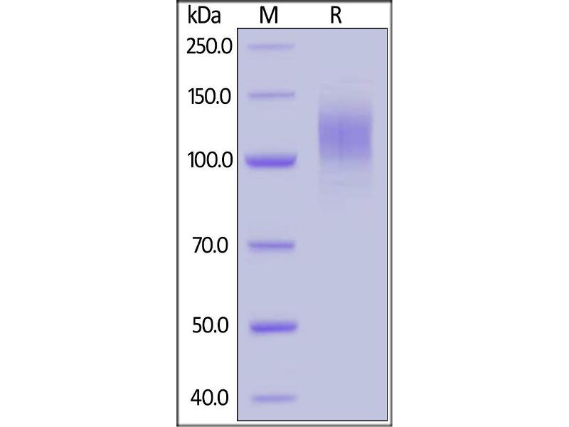 This protein carries a polyhistidine tag at the C-terminus. The protein has a calculated MW of 76.9 kDa. The protein migrates as 100-140 kDa under reducing (R) condition (SDS-PAGE) due to glycosylation. AA 16-685