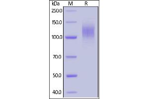 This protein carries a polyhistidine tag at the C-terminus. The protein has a calculated MW of 76.9 kDa. The protein migrates as 100-140 kDa under reducing (R) condition (SDS-PAGE) due to glycosylation.