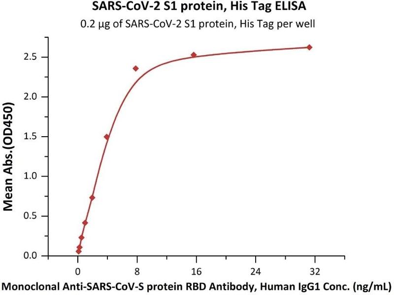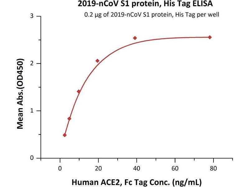 Immobilized 2019-nCoV S1 protein, His Tag at 2 μg/mL (100 μL/well) can bind Human ACE2, Fc Tag with a linear range of 2-20 ng/mL (QC tested).
