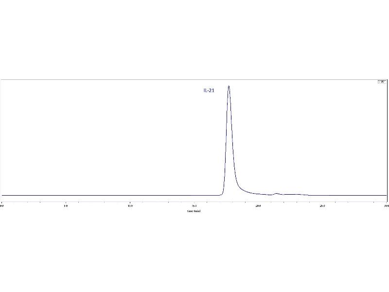 Interleukin-21 (IL-21) is a secreted protein which belongs to the IL-15 / IL-21 family. Interleukin-21 / IL-21 belongs to a family of cytokines that bind to a composite receptor consisting of a private receptor (IL21R) and the common cytokine receptor gamma chain (gamma(C)). Interleukin-21 / IL-21 impacts a number of cell types, including CD8+ memory T cells, NK cells and subsets of CD4 memory T cells. The IL-21R is widely distributed on lympho-haematopoietic cells. IL-21 is a pleiotropic cytokine produced by CD4+ T cells in response to antigenic stimulation. Its action generally enhances antigen-specific responses of immune cells. IL-21 promotes the anti-tumor activity of CD8+ T-cells and NK cells. IL-21 exerts its effect through binding to a specific type I cytokine receptor, IL-21R, which also contains the γ chain (γc) found in other cytokine receptors including IL-2, IL-4, IL-7, IL-9 and IL-15. The IL-21/IL-21R interaction triggers a cascade of events which includes activation of the tyrosine kinases JAK1 and JAK3, followed by activation of the transcription factors STAT1 and STAT3.