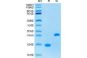 - 12.97 kDa. Due to glycosylation, the protein migrates to 14-15 kDa under reduced (R) condition, and 23-25 kDa under Non reducing (N) condition based on Tris-Bis PAGE result.