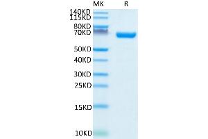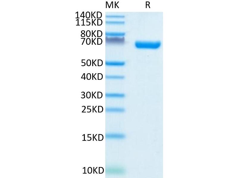- 56.6 kDa. Due to glycosylation, the protein migrates to 60-70 kDa based on Tris-Bis PAGE result.