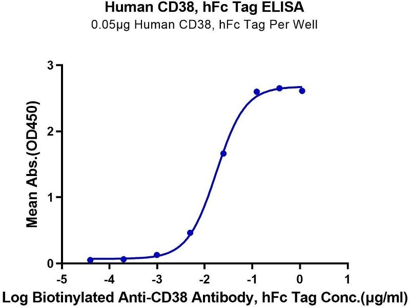 - Immobilized Human CD38, hFc Tag at 0.5μg/ml (100μl/well) on the plate. Dose response curve for Biotinylated Anti-CD38 Antibody, hFc Tag with the EC50 of 17.4ng/ml determined by ELISA. See testing image for detail.