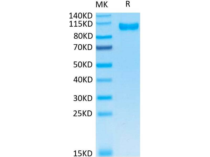 - 86.39 kDa. Due to glycosylation, the protein migrates to 90-115 kDa based on Tris-Bis PAGE result.