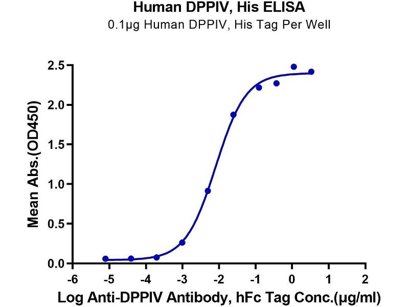 - Immobilized Human DPPIV at 1μg/ml (100μl/well) on the plate. Dose response curve for Anti-DPPIV Antibody, hFc Tag with the EC50 of 8.1ng/ml determined by ELISA. See testing image for detail.