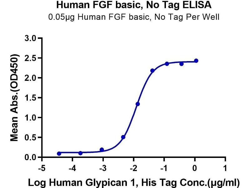 Immobilized Human FGF basic at 0.5μg/ml (100μl/Well) on the plate. Dose response curve for Human Glypican 1, His Tag with the EC50 of 12.3ng/ml determined by ELISA. See testing image for detail.