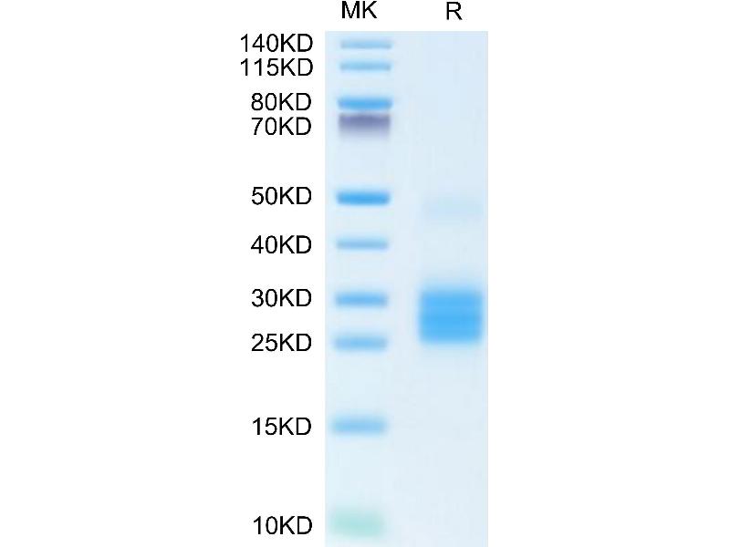 17.6 kDa. Due to glycosylation, the protein migrates to 25-30 kDa based on Tris-Bis PAGE result.