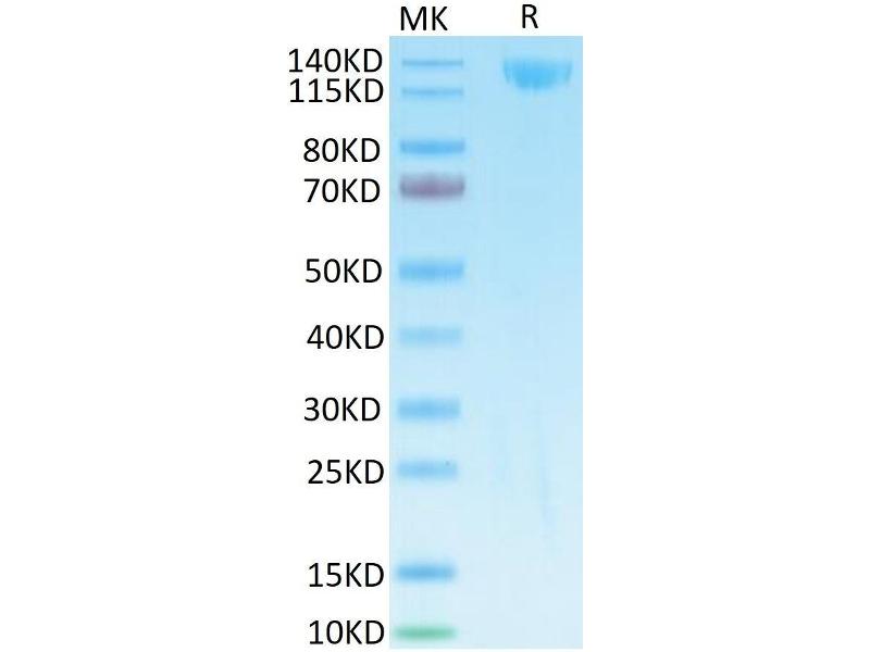 100.6 kDa. Due to glycosylation, the protein migrates to 120-140 kDa based on Tris-Bis PAGE result.