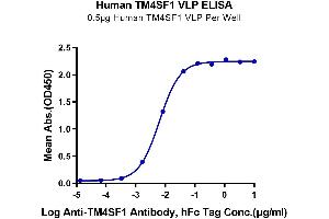 - Immobilized Human TM4SF1 VLP at 5μg/ml (100μl/Well) on the plate. Dose response curve for Anti-TM4SF1 Antibody, hFc Tag with the EC50 of 6.3ng/ml determined by ELISA.