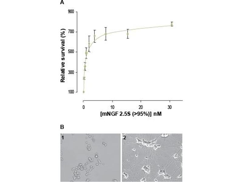 Nerve Growth Factor 2.5S,The neurotrophins ("neuro" means nerve and "trophe" means nutrient) are a family of soluble, basic growth factors which regulate neuronal development, maintenance, survival and death in the CNS and PNS.1NGF, the first member of the family to be discovered, was originally purified as a factor able to support survival of sympathetic and sensory spinal neurons in culture.2 It is synthesized and secreted by sympathetic and sensory target organs and provides trophic support to neurons as they reach their final target.3Neurotrophin secretion increases in the nervous system following injury. Schwann cells, fibroblasts, and activated mast cells normally synthesize NGF constitutively, however direct trauma and induction of cytokines combine to increase neurotrophin production in these cells after injury.4NGF is purified in three forms: the 7S, 2.5S and β. The 7S (130 kDa) form occurs naturally in mouse submaxillary glands, and is a multimeric protein composed of two α, one β and two γ subunits. The name is derived from its sedimentation co-efficient, 7S.The biologically active subunit is the β, which is a 26 kDa dimer composed of two identical 120 amino acid chains held together by hydrophobic interactions.5 The 2.5S form is 9 amino acids shorter than the β form because of proteolysis that occurs during the purification process.6 The structural hallmark of all the neurotrophins is the characteristic arrangement of the disulfide bridges known as the cysteine knot, which has been found in other growth factors such as Platelet-derived growth factor.7 There is a 95.8 % homology between the rat and mouse forms, and a 85 % homology between the human and mouse.NGF has been shown to regulate neuronal survival, development, function and plasticity.8 Recently, involvement of NGF in processes not involving neuronal cells has been shown, such as asthma,9 psoriasis10 and wound healing.11 The biological effects of NGF are mediated by two receptors: TrkA, which is specific for NGF, and p75NTR, which binds all the neurotrophins.12