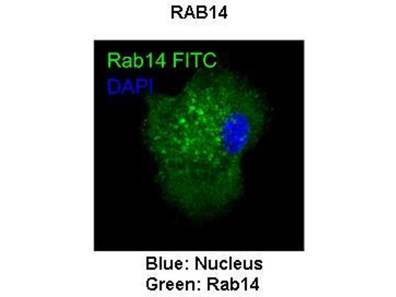 RAB14 belongs to the large RAB family of low molecular mass GTPases that are involved in intracellular membrane trafficking. These proteins act as molecular switches that flip between an inactive GDP-bound state and an active GTP-bound state in which they recruit downstream effector proteins onto membranes (Junutula et al., 2004 [PubMed 15004230]).[supplied by OMIM, Mar 2009].