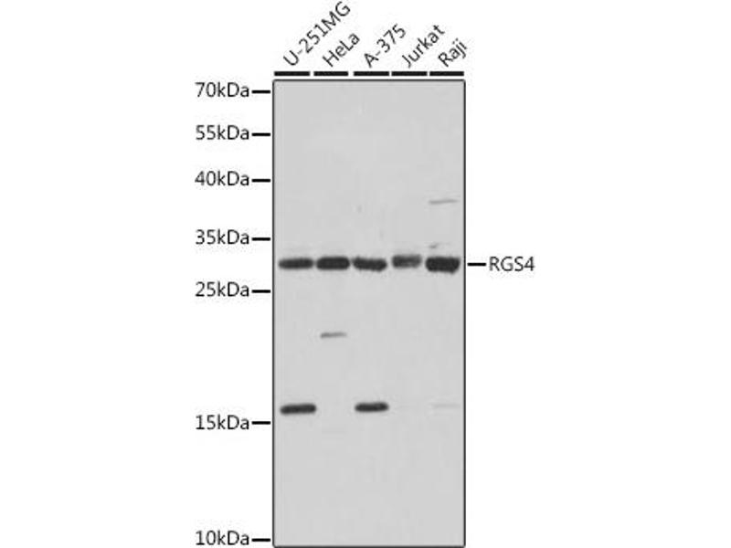 Regulator of G protein signaling (RGS) family members are regulatory molecules that act as GTPase activating proteins (GAPs) for G alpha subunits of heterotrimeric G proteins. RGS proteins are able to deactivate G protein subunits of the Gi alpha, Go alpha and Gq alpha subtypes. They drive G proteins into their inactive GDP-bound forms. Regulator of G protein signaling 4 belongs to this family. All RGS proteins share a conserved 120-amino acid sequence termed the RGS domain. Regulator of G protein signaling 4 protein is 37% identical to RGS1 and 97% identical to rat Rgs4. This protein negatively regulate signaling upstream or at the level of the heterotrimeric G protein and is localized in the cytoplasm. Alternatively spliced transcript variants have been found for this gene. [provided by RefSeq, Jul 2008].