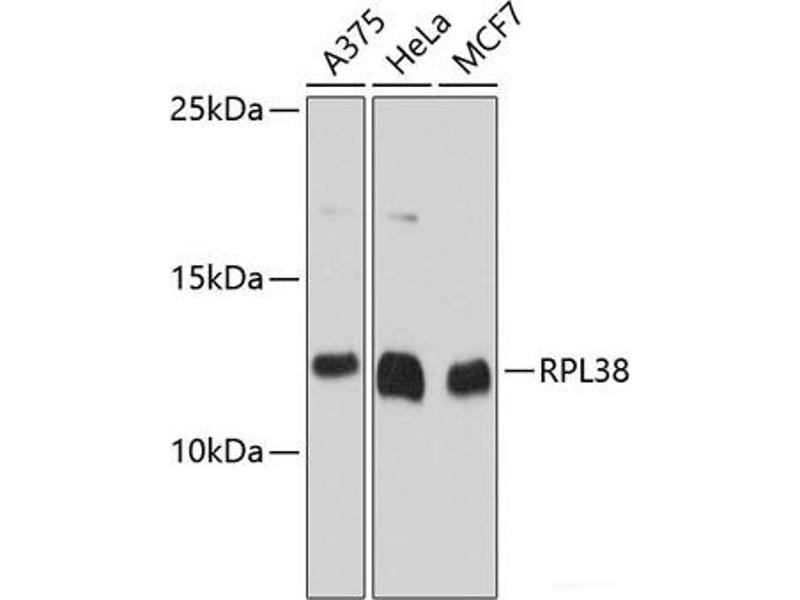 Ribosomes, the organelles that catalyze protein synthesis, consist of a small 40S subunit and a large 60S subunit. Together these subunits are composed of 4 RNA species and approximately 80 structurally distinct proteins. This gene encodes a ribosomal protein that is a component of the 60S subunit. The protein belongs to the L38E family of ribosomal proteins. It is located in the cytoplasm. Alternative splice variants have been identified, both encoding the same protein. As is typical for genes encoding ribosomal proteins, there are multiple processed pseudogenes of this gene dispersed through the genome, including one located in the promoter region of the type 1 angiotensin II receptor gene. [provided by RefSeq, Jul 2008].