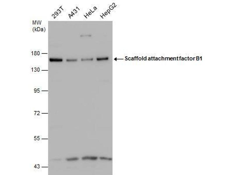 This gene encodes a DNA-binding protein which has high specificity for scaffold or matrix attachment region DNA elements (S/MAR DNA). This protein is thought to be involved in attaching the base of chromatin loops to the nuclear matrix but there is conflicting evidence as to whether this protein is a component of chromatin or a nuclear matrix protein. Scaffold attachment factors are a specific subset of nuclear matrix proteins (NMP) that specifically bind to S/MAR. The encoded protein is thought to serve as a molecular base to assemble a 'transcriptosome complex' in the vicinity of actively transcribed genes. It is involved in the regulation of heat shock protein 27 transcription, can act as an estrogen receptor co-repressor and is a candidate for breast tumorigenesis. This gene is arranged head-to-head with a similar gene whose product has the same functions. Multiple transcript variants encoding different isoforms have been found for this gene.[provided by RefSeq, Jan 2011].