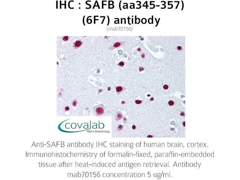 This gene encodes a DNA-binding protein which has high specificity for scaffold or matrix attachment region DNA elements (S/MAR DNA). This protein is thought to be involved in attaching the base of chromatin loops to the nuclear matrix but there is conflicting evidence as to whether this protein is a component of chromatin or a nuclear matrix protein. Scaffold attachment factors are a specific subset of nuclear matrix proteins (NMP) that specifically bind to S/MAR. The encoded protein is thought to serve as a molecular base to assemble a 'transcriptosome complex' in the vicinity of actively transcribed genes. It is involved in the regulation of heat shock protein 27 transcription, can act as an estrogen receptor co-repressor and is a candidate for breast tumorigenesis. This gene is arranged head-to-head with a similar gene whose product has the same functions. Multiple transcript variants encoding different isoforms have been found for this gene.[provided by RefSeq, Jan 2011].