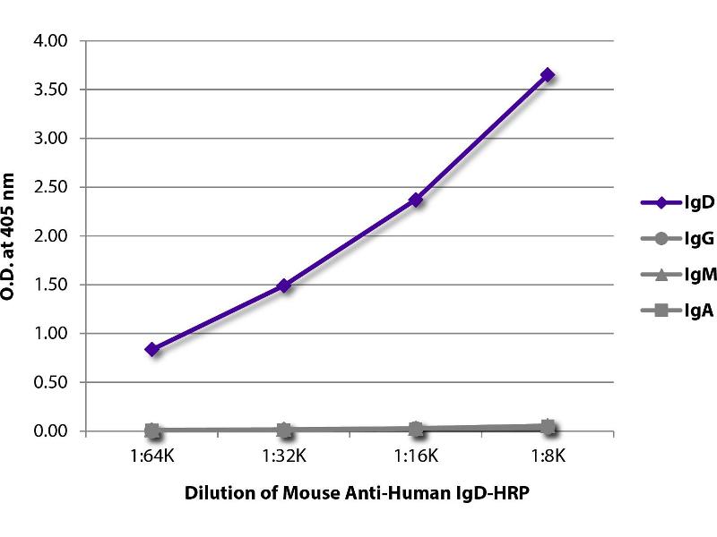 - Reacts with the heavy chain of human IgD as demonstrated by ELISA.