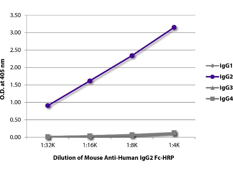 - Reacts with the Fc portion of the heavy chain of human IgG2 as demonstrated by ELISA
