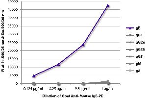 To insure lot-to-lot consistency, each batch of product is tested by ELISA for conformance to characteristics of a standard reference reagent. This product is not tested for reactivity to other species IgE. Source: Pooled antisera from goats hyperimmunized with BALB/c mouse IgE paraproteins.