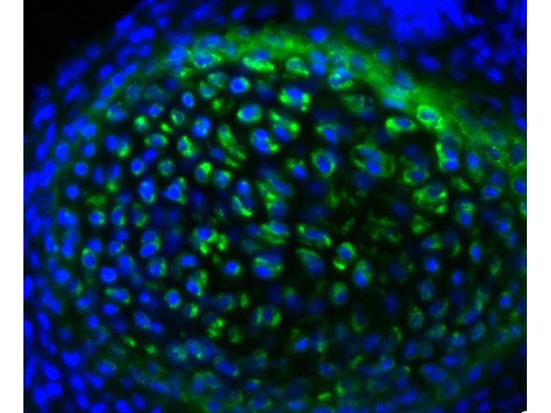 - Reacts with the heavy and light chains of goat IgG