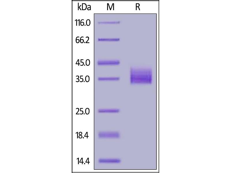 The purity of the protein is greater than 95 % as determined by SDS-PAGE and Coomassie blue staining.