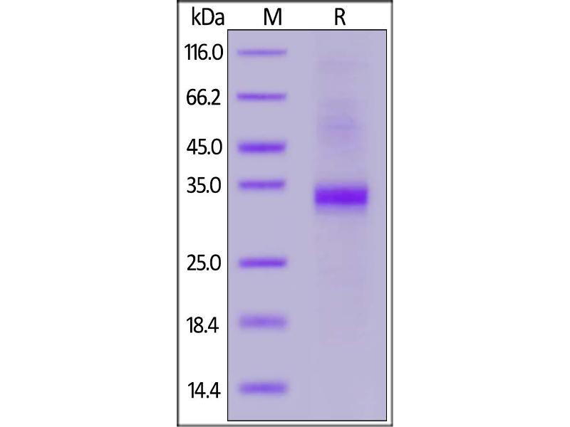 The purity of the protein is greater than 85 % as determined by SDS-PAGE and Coomassie blue staining.