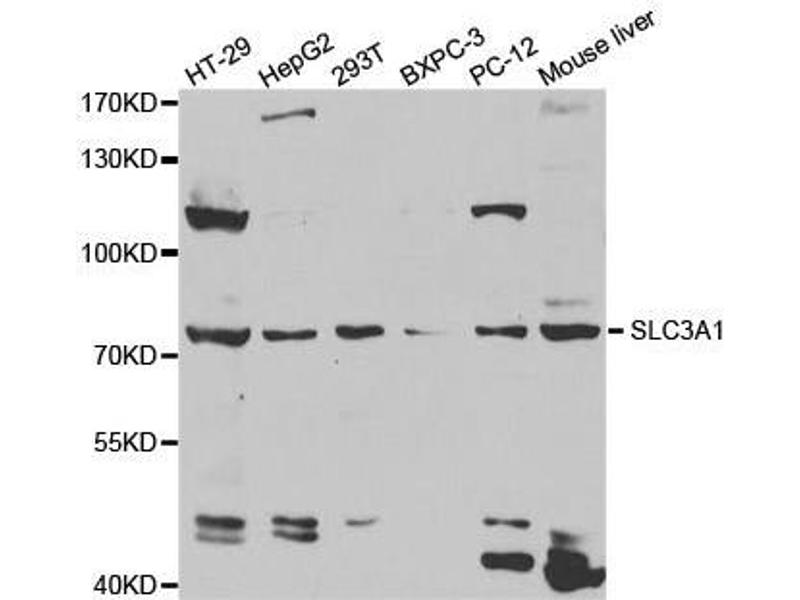 : "Human cystinuria-related transporter: localization and functional characterization." in: Kidney international, Vol. 59, Issue 5, pp. 1821-33, (2001) (PubMed).Aliases for Solute Carrier Family 3 Member 1 抗体