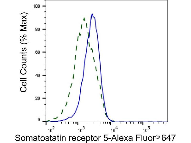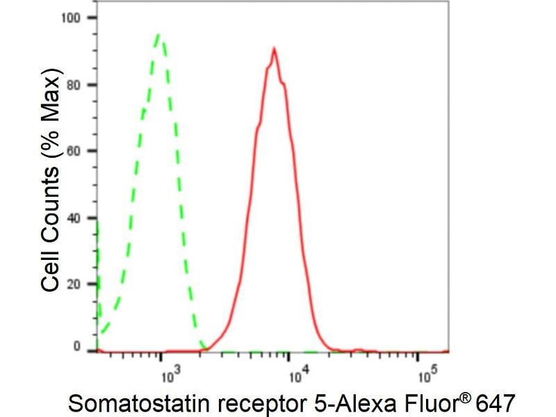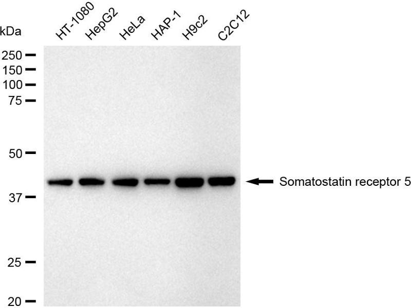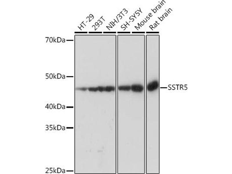 Somatostatin and its related peptide cortistatin exert multiple biological actions on normal and tumoral tissue targets by interacting with somatostatin receptors (SSTRs). The protein encoded by this gene is one of the SSTRs, which is a multi-pass membrane protein and belongs to the G-protein coupled receptor 1 family. The activity of this receptor is mediated by G proteins which inhibit adenylyl cyclase, and different regions of this receptor molecule are required for the activation of different signaling pathways. A mutation in this gene results in somatostatin analog resistance. Alternatively spliced transcript variants have been identified in this gene.[provided by RefSeq, Feb 2010].