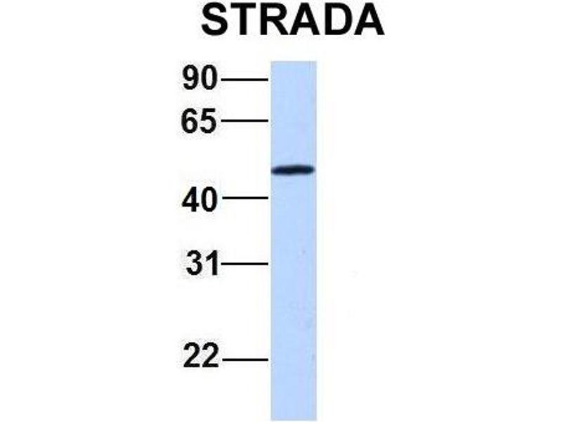 The protein encoded by this gene contains a STE20-like kinase domain, but lacks several residues that are critical for catalytic activity, so it is termed a 'pseudokinase'. The protein forms a heterotrimeric complex with serine/threonine kinase 11 (STK11, also known as LKB1) and the scaffolding protein calcium binding protein 39 (CAB39, also known as MO25). The protein activates STK11 leading to the phosphorylation of both proteins and excluding STK11 from the nucleus. The protein is necessary for STK11-induced G1 cell cycle arrest. A mutation in this gene has been shown to result in polyhydramnios, megalencephaly, and symptomatic epilepsy (PMSE) syndrome. Multiple transcript variants encoding different isoforms have been found for this gene. Additional transcript variants have been described but their full-length nature is not known. [provided by RefSeq, Sep 2009].