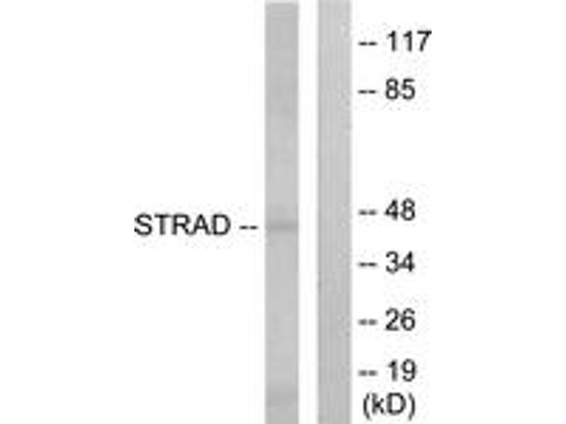 The protein encoded by this gene contains a STE20-like kinase domain, but lacks several residues that are critical for catalytic activity, so it is termed a 'pseudokinase'. The protein forms a heterotrimeric complex with serine/threonine kinase 11 (STK11, also known as LKB1) and the scaffolding protein calcium binding protein 39 (CAB39, also known as MO25). The protein activates STK11 leading to the phosphorylation of both proteins and excluding STK11 from the nucleus. The protein is necessary for STK11-induced G1 cell cycle arrest. A mutation in this gene has been shown to result in polyhydramnios, megalencephaly, and symptomatic epilepsy (PMSE) syndrome. Multiple transcript variants encoding different isoforms have been found for this gene. Additional transcript variants have been described but their full-length nature is not known. [provided by RefSeq, Sep 2009].
