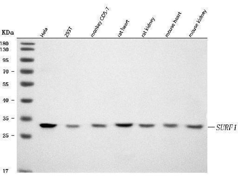 This gene encodes a protein localized to the inner mitochondrial membrane and thought to be involved in the biogenesis of the cytochrome c oxidase complex. The protein is a member of the SURF1 family, which includes the related yeast protein SHY1 and rickettsial protein RP733. The gene is located in the surfeit gene cluster, a group of very tightly linked genes that do not share sequence similarity, where it shares a bidirectional promoter with SURF2 on the opposite strand. Defects in this gene are a cause of Leigh syndrome, a severe neurological disorder that is commonly associated with systemic cytochrome c oxidase deficiency. [provided by RefSeq, Jul 2008].