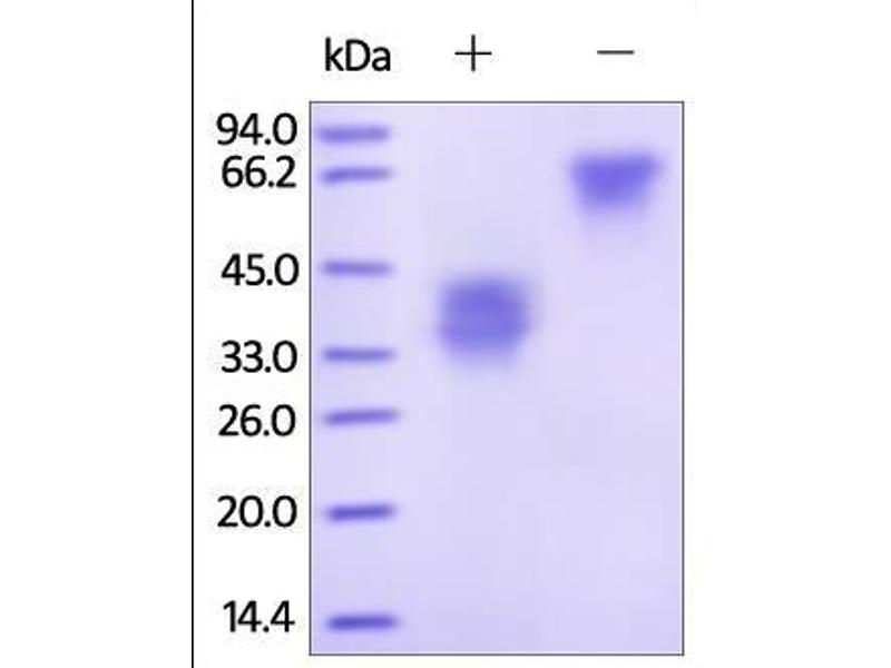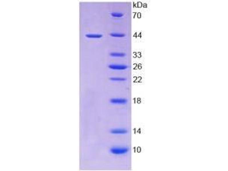 The purity of the protein is greater than 90 % as determined by SDS-PAGE and Coomassie blue staining.